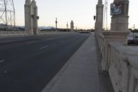 A panoramic view of the downtown area of Los Angeles, California, USA at dawn, featuring the city's infrastructure, architecture, vehicles, and other modes of transport such as roads, highways, bridges, and walkways. The evening sky is clear, and Armco barriers line the roads. The cityscape includes residential areas, art districts, and many other buildings and structures along the road surface.
