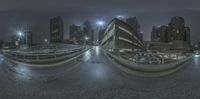 The urban skyline of Los Angeles, California is illuminated by artificial light and the reflection of the dome of a stadium in the wet asphalt of a controlled access highway during a winter night.