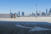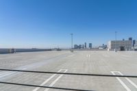 Aerial view of the urban skyline of Los Angeles, California, USA, showcasing the city's impressive architecture and infrastructure. The clear sky and open spaces provide a stunning backdrop to the bustling city life and modern urban design. The concrete roads and parking lots seamlessly integrate with the surrounding buildings, creating a cohesive and organized cityscape. This overview captures the essence of this metropolitan area, with its towering skyscrapers, office buildings, and residential properties.