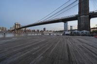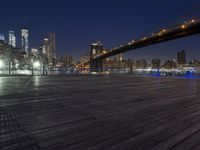 A parking lot in Manhattan, New York, USA, illuminated by artificial light and reflections in the river. The cityscape is made up of skyscrapers, wood floor and asphalt roads. A walkway and bridge provide a fixed link across the metropolitan area in this winter night view.