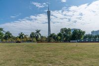 The modern architecture and cityscape of Guangzhou, Guangdong, China is illuminated against a clear sky, with pavers, walls, and open grass surfaces visible in the foreground.