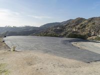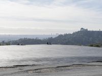 Aerial view of a city skyline, lake and mountain range at dawn, overlooking the water resources, shore and coastal bay in the distance.