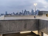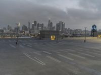A scene of the city skyline at dawn, featuring brutalist architecture, corporate headquarters, and other iconic structures illuminated by artificial light and street lights, with a backdrop of wintery cloud, sky, and sea. The urban landscape includes a sea of asphalt roads, a parking lot, wind turbines, and trees.