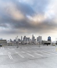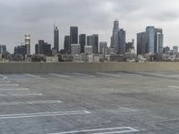 An urban winter dawn in a metropolitan area, featuring a skyline dotted with skyscrapers and a concrete parking lot surrounded by asphalt roads and freeezing water. The roads and buildings form a complex line structure of high-rise architecture, creating a unique cityscape.