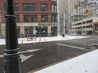 A view of a classic downtown architecture in Detroit, USA, on a snowy winter day. Cars travel along the asphalt road, while pedestrians walk along the pedestrian lane and the cloudy sky looms above the bustling metropolitan area.