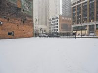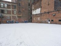 A view of a residential area in Detroit, USA. The scene is a cold winter day, with buildings featuring brick walls, wood roofs, and windows covered in freezing snow and ice, while a blizzard is brewing in the background. Skyscrapers, a parking lot, trees, and an art district are visible in the urban landscape.