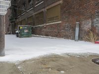 An urban winter view of a residential area in Detroit, USA. A vehicle drives down a snow-covered lane with a brick wall, buildings, and trees visible along the concrete curb. A cloud hangs over the metropolitan area as the facade and infrastructure of the art district structure the view straight down the road.