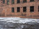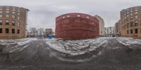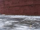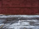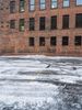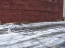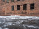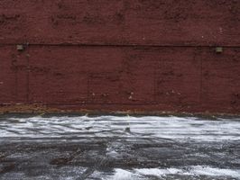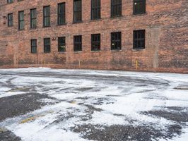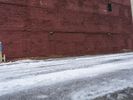 A view of a residential area in Detroit, Michigan, USA, on a cold winter day. The city street shows a parking lot, asphalt road surface, and a brick wall in an art district.