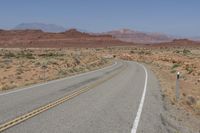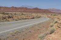 A straight asphalt road cuts through the stunning desert landscape of Utah's red rocks, offering a scenic drive through the canyonlands. The road surface stretches into the horizon, surrounded by vegetation and towering mountains. The clear sky and elevated terrain create a highland view, with grass and shrubs growing alongside the road. In the distance, Lake Powell can be seen, adding to the natural beauty of this picturesque location.