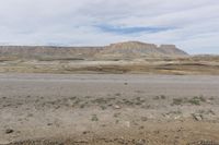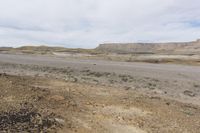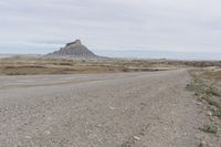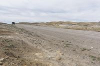 A scenic drive along a dirt road through the stunning landscape of Utah's Canyonlands. The road cuts through the red rock formations of San Rafael Swell, creating a lunar-like landscape. The grey sky and low clouds add to the dramatic beauty of this off-road track.