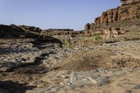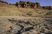 A stunning view of the red rock desert landscape in Utah, USA. The rugged terrain, brown bedrock, and open spaces create a captivating scene under the clear sky.