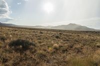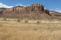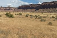 Scenic view of the red rock desert landscape in the Needles District of Canyonlands National Park, Utah, USA. The photo captures the rugged mountains, open grassy spaces, and vast valleys, with stunning red rock formations and a cloudy sky. The grassy surface, dirt, and gravel roads add to the natural beauty of this dawn scene.