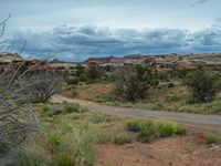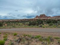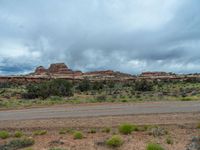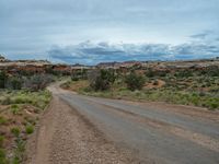 In the heart of Utah's stunning canyon landscape, a road cuts through the red rock, leading straight ahead under the grey sky. The gloomy day adds a unique profile to the scenery, with gravel and dirt streets weaving through the nature-filled surroundings. Clouds hover above, casting a somber yet captivating atmosphere over the one-quarter stretch of the road.