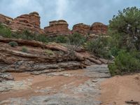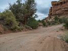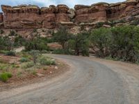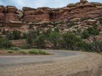 In the heart of Utah's stunning landscape, a gravel road winds through the red rock canyons under a grey sky. The gloomy day adds a sense of mystery to the open space, with clouds casting shadows over the dirt streets. Nature's beauty is showcased in the desolate yet captivating scenery, where the road leads travelers on a journey through the rugged terrain.