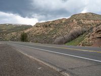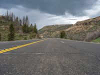 In the heart of Utah's vast landscape, a road winds through the forest, surrounded by majestic mountains. The gloomy grey sky adds a sense of mystery to the scene, while the clouds create a dramatic backdrop. As you drive along the asphalt road, you'll be captivated by the beauty of the nature that surrounds you. The tranquil atmosphere and the one-quarter angle of the road make this a truly unique and memorable experience.