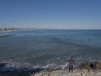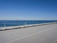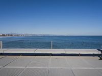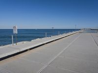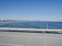 A sunny day in Valencia, Spain, with its vibrant coastal cityscape, natural environment, and fun recreation. The view includes a concrete street, boardwalk, bridge, deck, jetty, pier, and walkway along the shore, with a blue ocean and horizon in the background.