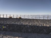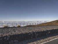 Vacationers arrive to take in the stunning views of the Spanish countryside in Tenerife. The sun is visible in a clear sky, as they walk along a boardwalk past a stone wall and guard rail. The landscape stretches out before them, with rolling hills, mountains, and coastal shorelines. A winter day brings sunshine to the surface of a reservoir, with trees, asphalt paths, and cobble stone pavers all adding to the recreational atmosphere of the destination.