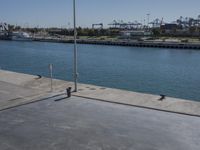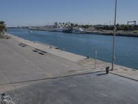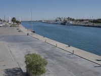 The vibrant city of Valencia, Spain is a popular tourist destination with its modern architecture, mixed-use residential areas, beaches, and boardwalks along the coast of the Mediterranean Sea. A walkway provides a view of the shoreline, with a harbor, jetty, pier, and riverbank visible in the distance. A clear sky frames the elevated concrete street, with trees, vegetation, and vehicles adding to the urban design of the area.