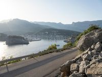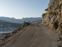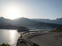 A stunning coastal landscape of the Balearic Islands, Spain is visible from the elevated view of an Armco barrier on a switchback road at the top of a hill with sunlight filtering through the clear sky. The asphalt parking lot, ocean, and open spaces are visible.