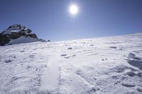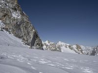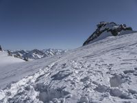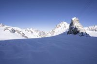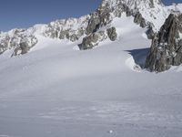 A stunning view of the Alps mountain range in Italy on a sunny winter day. The summit of Nunatak provides an overlook of the snow-covered glaciers, rocky walls, and massifs, as well as the tourist attraction of ski slopes and pistes. The clear sky and ice caps in the distance create a picturesque landscape.