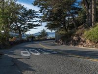 View of a suburban road in San Francisco, California, USA, seen from a high overlook. The asphalt road curves and stretches straight down the road, providing a recreational view of the cityscape and skyline with a clear sky at dawn.