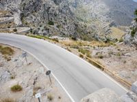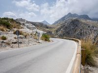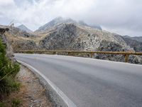 A winding road cutting through the mountainous terrain of Spain, with a view of the coastline of the Balearic Islands, its shoreline and surrounding vegetation, as well as a bridge and a fixed link curving along the horizon on a winter day. The natural beauty of the landscape is complemented by the infrastructure of the road, with guard rails, Armco barriers, and a lane of asphalt. Clouds drift in the sky above.