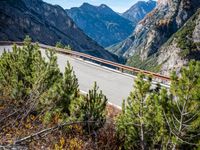 A winding road bordered by an Armco barrier winds through the mountain landscape, providing a breathtaking overview of Italy on a sunny day. Clouds and contrails drift in the sky above, giving the scene a beautiful sense of depth and perspective.