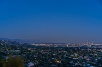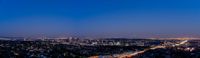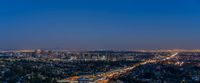A modern cityscape of Los Angeles, California, USA is illuminated by artificial light in the clear night sky, offering an overview of the city from above.