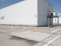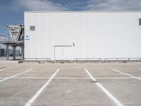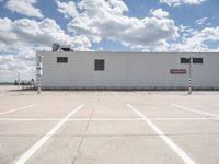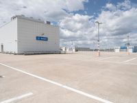 A straight view down a concrete road in Berlin, Germany reveals a mix of industrial, modern architecture, warehouses, and parking garages in the open space below a clear, cloudless sky.