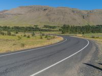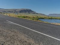 A motor vehicle is seen driving straight down the road in Iceland, surrounded by a beautiful landscape of mountains, vegetation, and a lake in the foreground. The road surface consists of asphalt, tar, and Armco Barrier, with a bridge and river running alongside and a clear sky above. This stunning mountain landform and natural environment provides a stunning view of the horizon.