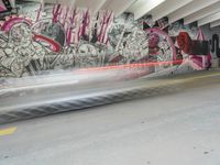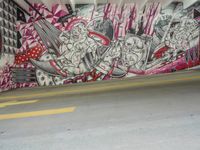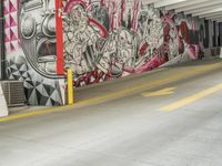 A highway entrance in Detroit, Michigan leads to an art district, with a bright yellow line on the road surface, a graffiti wall, a pink tree, and a mural. Automobiles and other vehicles race along the concrete road, illuminated by artificial light.