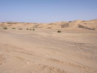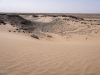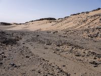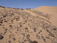 Aerial view of the rugged terrain of the Moroccan Erg desert, vast sea of sand dunes and wadis surrounded by mountains, full of natural rock formations. The clear sky is reflecting on the surface of the soil, gravel and sand, forming an Aeolian Landform on the Makhtesh Plateau.