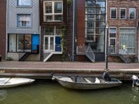 A view of the pier and harbor in the city of Holland, Netherlands, with boats, buildings, and classic architecture in the background. A road, a highway entrance, a boat ramp, and vegetation are also visible, all set against a beautiful blue sky.