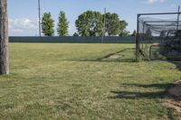 A beautiful day in Bancroft, Iowa, showcasing the wide open space and lush green grass of this rural property. The grass surface is well-maintained, perfect for recreational activities like baseball. The clear sky and fluffy clouds create a picturesque backdrop for this countryside scene.