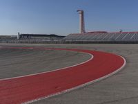 A dawn-lit asphalt S-curve curves its way through a coastal landscape, highlighting the infrastructure of the highway, race track and grandstands as the sun rises over the distant mountain range.