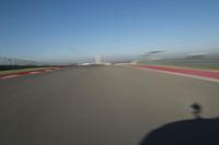 An aerial view of the winding highway and its S-curve, illuminated by the morning sun. Automobiles and airplanes travel along the road, surrounded by the landscape of sea, sand, and steppe.