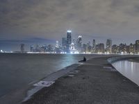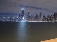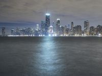 The night sky fades to dawn as the skyline of Chicago, Illinois in the United States reveals itself over the waters of Lake Michigan. As the metropolitan area of the city is illuminated, the urban scene of skyscrapers, roads and trees are seen in the reflection below.