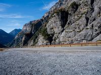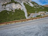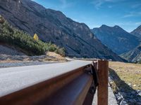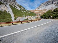 An armco barrier stands along a long and straight road in the Italian Alps, with a view of rolling hills and mountains beyond. The sky is filled with wispy clouds and contrails, making for a spectacular day in nature.