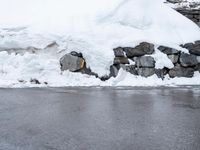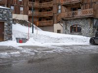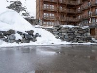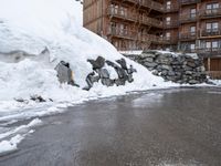 A road winds through a suburban area in the French Alps on a winter day, with snow-covered mountains, open space, and a wet asphalt surface. Tourist attractions, hotels, and ski resorts can be found in the area, surrounded by a rock wall as clouds fill the sky.