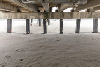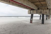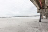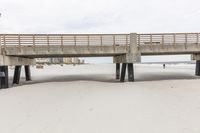 A serene view of Miami's coastal area during a winter day, with a grey sky and calm ocean surface. A concrete bridge and a wooden pier can be seen in the distance, providing an architectural profile against the open space.
