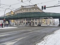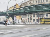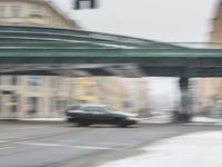 A snowy day in Berlin, Germany, showcasing the city's infrastructure and transportation. The image features a road with asphalt covered in snow, a bridge with an underpass, various buildings, street lights, and a tram passing by. The grey sky and motion blur add to the urban atmosphere of the scene.