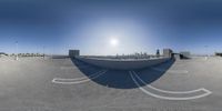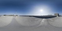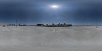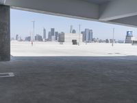 A concrete and asphalt structure with a clear sky overhead, this parking garage stands out amongst the city skyline on a winter day. Snow coats the ground, roof, and windows, creating a unique winter parkdeck surface.