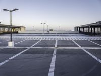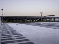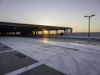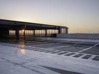 The afterglow of dawn tints the winter atmosphere of the city, as its infrastructure and urban design come to life. Trees, vegetation, and the lake in the distance provide a contrast to the asphalt, tar, curb, and parking lot. The building facade is illuminated by street lights and sunlight, casting a shade across the composite material roof, floor, and fixtures.