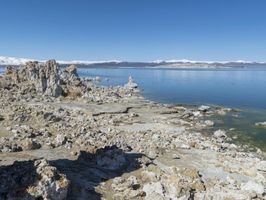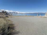 A gravel beach stretches out to meet the sea, with sand, water, and a clear winter sky providing a picturesque view of the recreational open space.