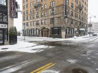 A winter scene in Detroit, USA, featuring a classic brick wall, a neighborhood of houses, and a crosswalk leading to an asphalt road. Snow is falling on the cars and the buildings in the urban public space.