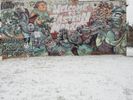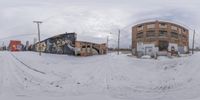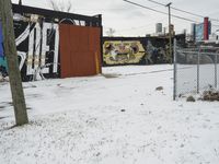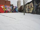 A residential area of Detroit illuminated by a winter day and under a thick cloud of snow, featuring a graffiti wall, tree, curb, open space, and a freezing parking lot.