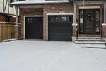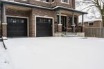 A snowy residential area in Canada with houses, trees, and an open space covered in snow under a grey sky during the winter season.