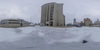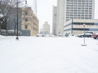 A view of a residential area in Detroit, USA on a freezing winter day, with snow covering the modern architecture and trees of the public space.