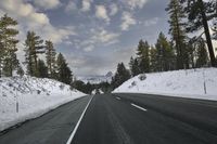 Early morning view of a snow-covered California highway, surrounded by mountains and trees.