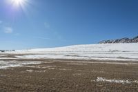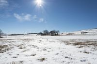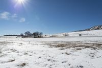 A snowy winter day in Denver, Colorado, showcasing the low mountains, open grass fields, and endless clear skies.